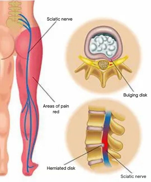 When a disc prolapses, it can press on nearby nerves, causing back pain, numbness, weakness, or tingling, often affecting the legs.
